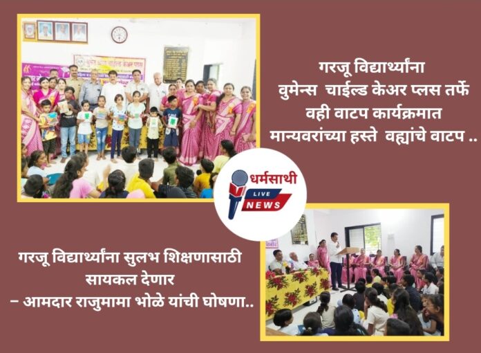 गरजू विद्यार्थ्यांना सुलभ शिक्षणासाठी सायकल देणार – आमदार राजुमामा भोळे यांची घोषणा..वुमेन्स चाईल्ड केअर प्लस तर्फे वही वाटप कार्यक्रमात मान्यवरांच्या हस्ते वह्यांचे वाटप ..