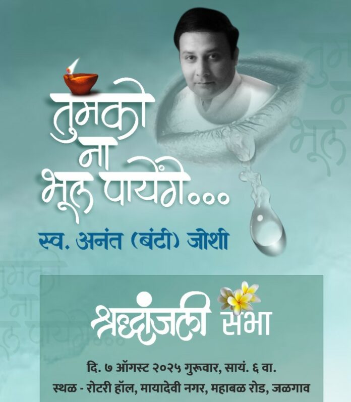 जळगांव – दि.६ (धर्मसाथी मीडिया नेटवर्क) तुमको ना भूल पायेंगे..बंटी जोशी यांना श्रद्धांजली वाहण्यासाठी शोकसभेच आयोजन करण्यात आले आहे.आज दि.७ ऑगस्ट २०२५ गुरुवारी,सायं.६ वा.रोटरी हॉल,मायादेवी नगर,जळगाव येथे मित्र परिवारातर्फे हे आयोजन करण्यात आले आहे.