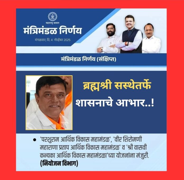 परशुराम आर्थिक विकास महामंडळ कल्याणकारी योजनांना मंजुरी..ब्रह्मश्री संस्थेने शासनाचे मानले आभार.