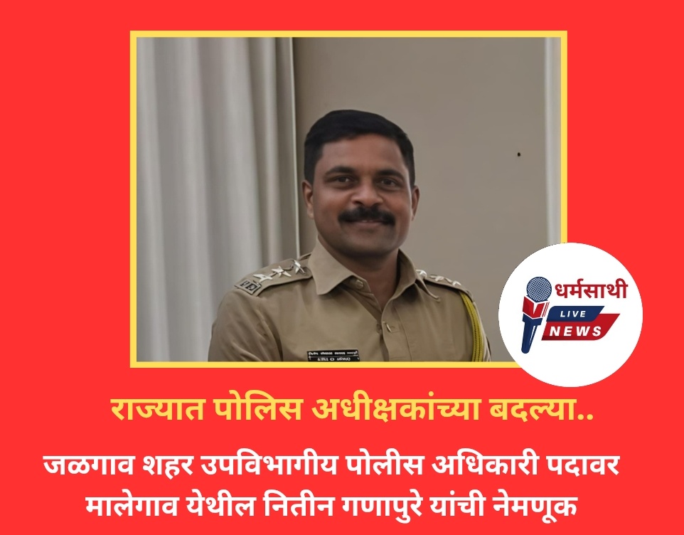 जळगांव – दि.८ (धर्मसाथी मीडिया नेटवर्क) महाराष्ट्र राज्यातील पोलिस अधीक्षक यांच्या बदल्या महाराष्ट्र शासनाच्या गृह विभागाने,पोलिस सेवा अधि.नुसार प्रशासकीय कारणास्तव,राज्य पोलीस सेवेतील अधिकाऱ्यांच्या बदल्यांचा आदेश जारी केला आहे. शासनाच्या आदेशाने जळगावात दोन नवीन अधिकारी तर पदोन्नतीने १ असे तीन अधिकारी जिल्ह्यात येणार आहेत.