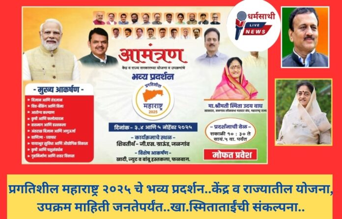 जळगाव दि.३ – (धर्मसाथी मीडिया नेटवर्क)जळगाव लोकसभेच्या खासदार स्मिताताई वाघ यांच्या संकल्पनेतून केंद्र व राज्य सरकारच्या योजना व उपक्रमांच्या प्रगतिशील महाराष्ट्र २०२५ भव्य प्रदर्शन आज दिनांक ३, ४ आणि ५ नोव्हेंबर २०२५ पासून शिवतीर्थ, (जी एस ग्राउंड) जळगाव येथे आयोजित करण्यात आले असून या भव्य प्रदर्शनीचे उद्घाटन उत्साहात मान्यवरांच्या शुभहस्ते संपन्न झाले.