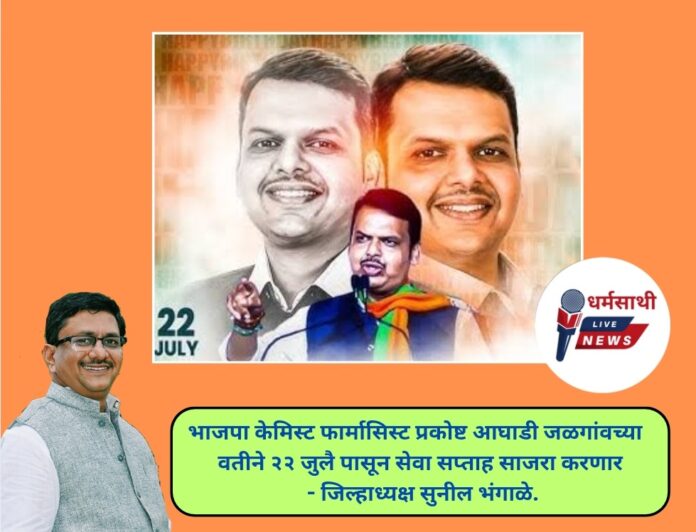 जळगांव – दि.१८ (धर्मसाथी मीडिया नेटवर्क) भाजपा केमिस्ट फार्मासिस्ट प्रकोष्टच्या वतीने महाराष्ट्र राज्याचे मुख्यमंत्री ना.देवेंद्रजी फडणवीस यांच्या जन्मदिना निमीत्त जळगांव जिल्हाभर २२ जुलैपासून सेवा सप्ताह साजरा करणार आहेत.