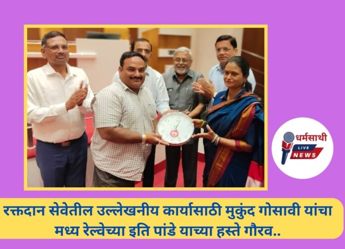 रक्तदान सेवेतील उल्लेखनीय कार्यासाठी मुकुंद गोसावी यांचा मध्य रेल्वेच्या इति पांडे याच्या हस्ते गौरव…