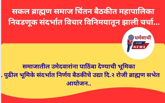 तसेच उद्या दि.२ जानेवारी रोजी सायंकाळी ७ वाजता ब्राह्मण सभेत आयोजित पुढील समाज बांधवांच्या दृष्टीने महत्वपूर्ण चिंतन व मार्गदर्शन बैठकीत सर्वानुमते अंतिम निर्णयावर शिक्का मोर्तब केले जाणार आहे .व तो एकमताने केलेला निर्णय ती घोषणा प्रसिद्धीला दिली जाणार आहे.तरी संबंधित संस्था प्रमुख,पदाधिकारी,ब्राह्मण समाजातील विविध क्षेत्रातील मान्यवर,सामाजिक कार्यकर्ते यांनी उपस्थिती देवून सहभागी व्हावे असे आवाहन ब्राह्मण सभा व सकल ब्राह्मण समाजाच्या वतीने करण्यात आले आहे.अशी माहिती सकल ब्राह्मण समाजाच्या वतीने ब्राह्मण सभा अध्यक्ष नितीन कुळकर्णी यांनी धर्मसाथी लाईव्ह न्यूज बोलताना दिली.