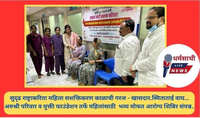 विश्वनेता,देशाचे लाडके प्रधानमंत्री नरेंद्र मोदी यांच्या वाढदिवसानिमित्त विशेष सेवा सप्ताह अंतर्गत स्वस्थ नारी सशक्त परिवार कार्यक्रमाचे आयोजन राष्ट्रकल्याणार्थ सामाजिक बांधिलकी जोपासत सामाजिक सेवाभावी संस्था मुक्ती फाउंडेशन व अरुश्री परिवार यांच्या माध्यमाने श्रीराम भवन येथील अरुश्री हॉस्पिटल येथे महिलांसाठी भव्य मोफत आरोग्य तपासणी, औषधोपचार,मार्गदर्शन शिबिराचे विशेष आयोजन करण्यात आले होते. या आरोग्य शिबिरामध्ये महिला रुग्णांची डॉ.स्वाती परिक्षीत बाविस्कर,एमडी मेडिसिन यांच्या टीमने हृदयरोग (हार्ट),रक्तदाब (बीपी),मधुमेह (डायबिटीस),थायरॉईड,जनरल तपासणी,फुप्फुस तपासणी फुफ्फुसीय कार्य चाचणी (Pulmonary Function Test)”आदीं तपासण्या केल्या.